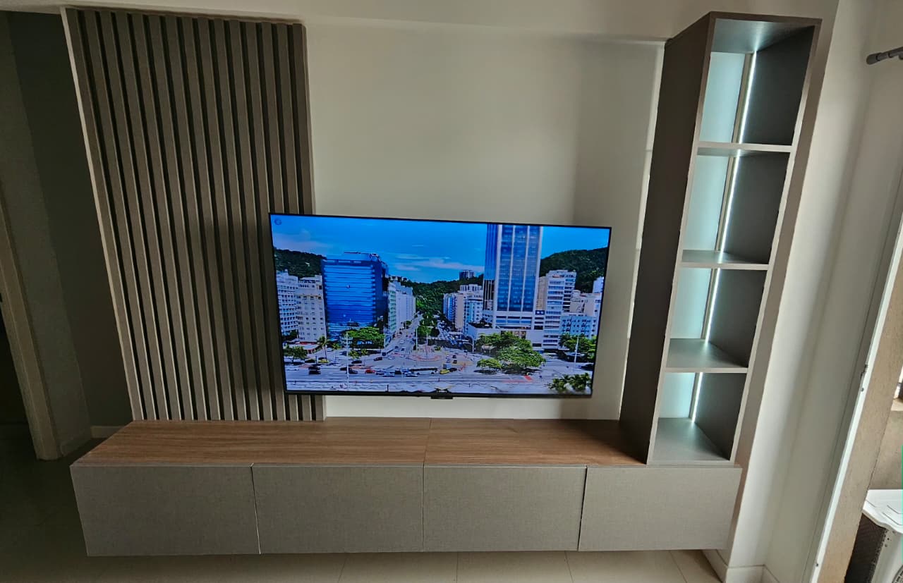 El Rack Valencia combina estética moderna con funcionalidad premium. Cuenta con un panel varillado decorativo, módulo flotante y una torre lateral con iluminación LED integrada. Fabricado con materiales de alta calidad, es ideal para living, playroom o sala principal.