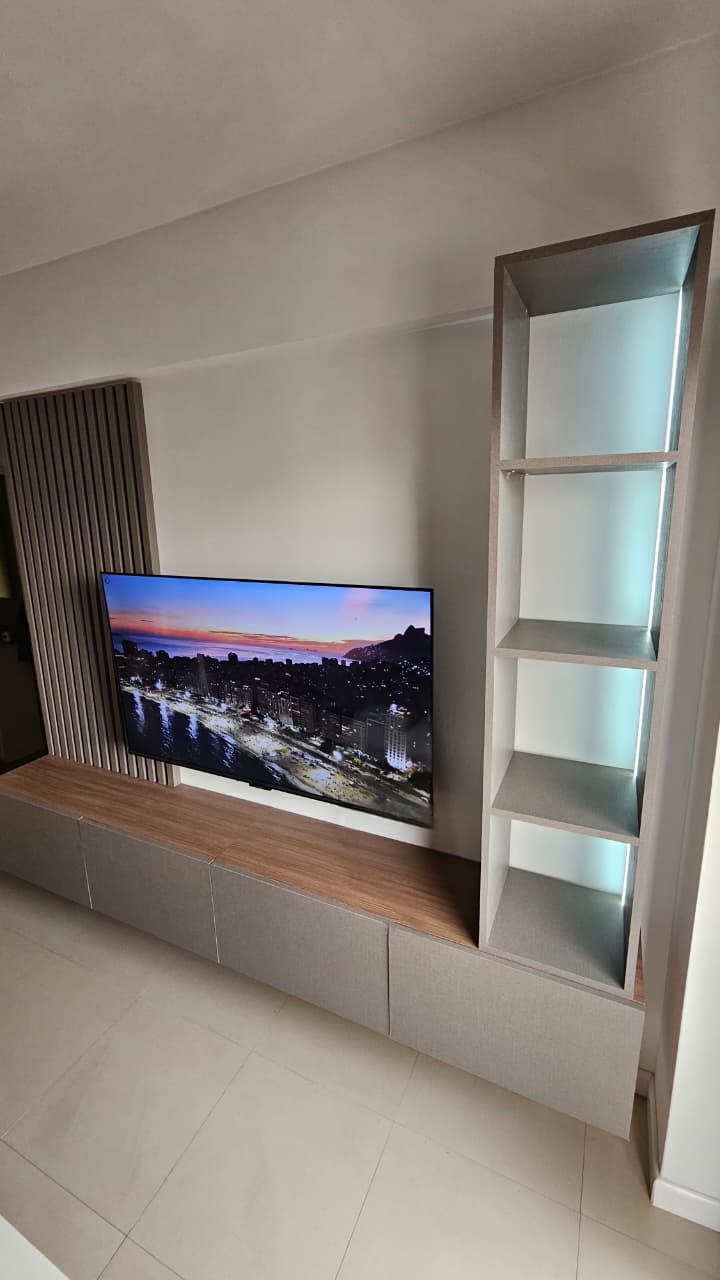 El Rack Valencia combina estética moderna con funcionalidad premium. Cuenta con un panel varillado decorativo, módulo flotante y una torre lateral con iluminación LED integrada. Fabricado con materiales de alta calidad, es ideal para living, playroom o sala principal.